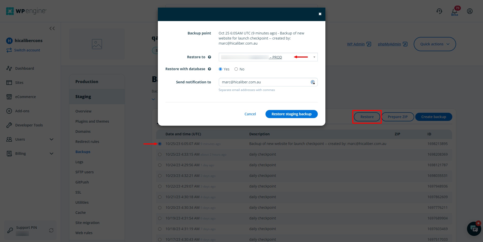 - Once the backup above is complete, the next step is to use replace the Production Environment with the backup you have just taken of the Staging Environment. We use the Restore option for this, see screenshot below.